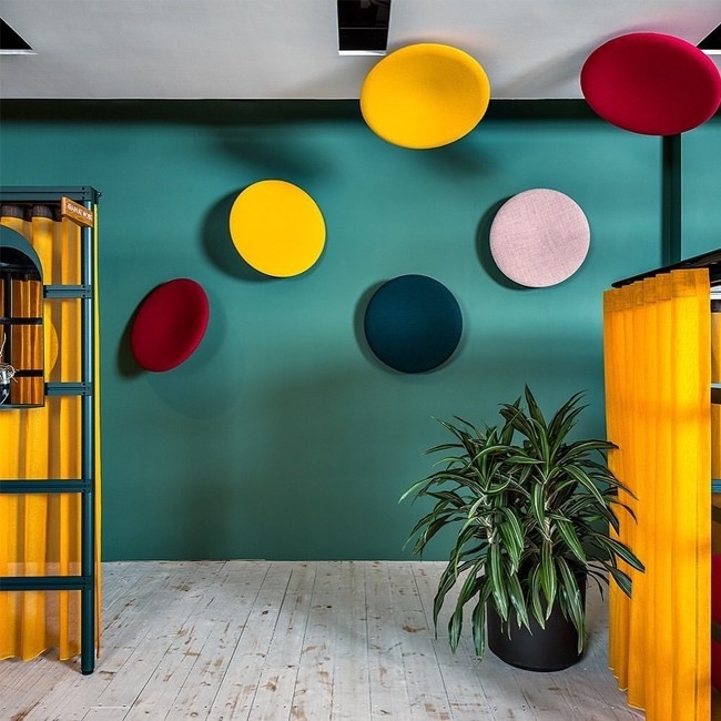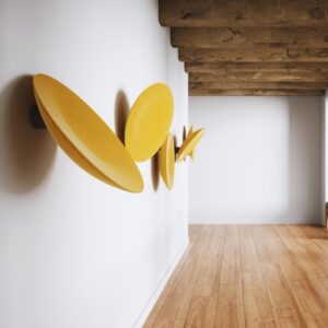 De BuzziDish is een zeer functioneel wandpaneel. Door zijn draaifunctie is hij niet alleen bij te stellen naar de plek waar meer absorptie gewenst maar hij komt hier door ook los van de wand en absorbeert aan twee kanten. Door zijn ietwat holle vorm zal hij nog meer geluidsreflecties opvangen.
