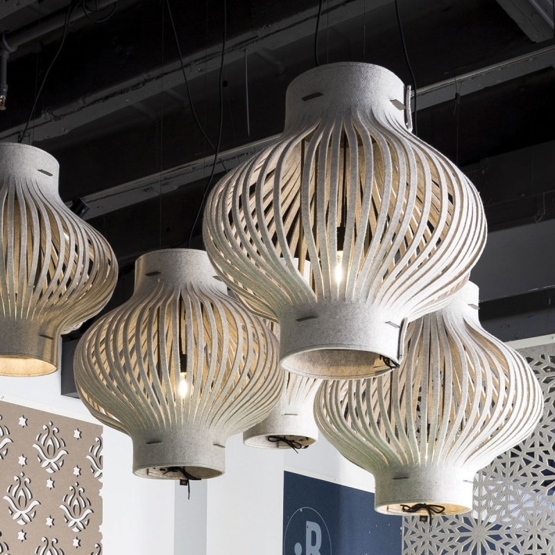 Terwijl het licht door de patronen gluurt, strekken dramatische schaduwen zich uit naar de muren. Ondanks het lichtgewicht ontwerp heeft het vilten lichaam een groot oppervlak dat met een cilindrisch ontwerp geluidsgolven vasthoudt in zijn ronde lichaam. De ronde vorm vermindert op zijn beurt het geluid van alle kanten. Combineer verschillende ophang hoogtes om te voorkomen dat het geluid zich verplaatst in grote ruimtes met hoge plafonds.