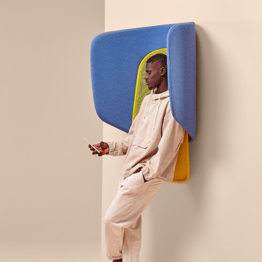 Neem plaats met je rug tegen de leuning en de akoestische kap en ervaar een zekere mate van privacy in drukke omgevingen zoals kantoren, grote gemeenschappelijke ruimtes of luchthavens. Voer hier een rustig telefoongesprek weg van alle drukte. De kap draagt bij aan een betere akoestiek dankzij de gebogen gestoffeerde panelen. De vorm weerkaatst het geluid terug naar de persoon die belt, waardoor deze op natuurlijke wijze zijn stem dempt, terwijl de gewatteerde bekleding de weerkaatsing van de kamer helpt dempen.