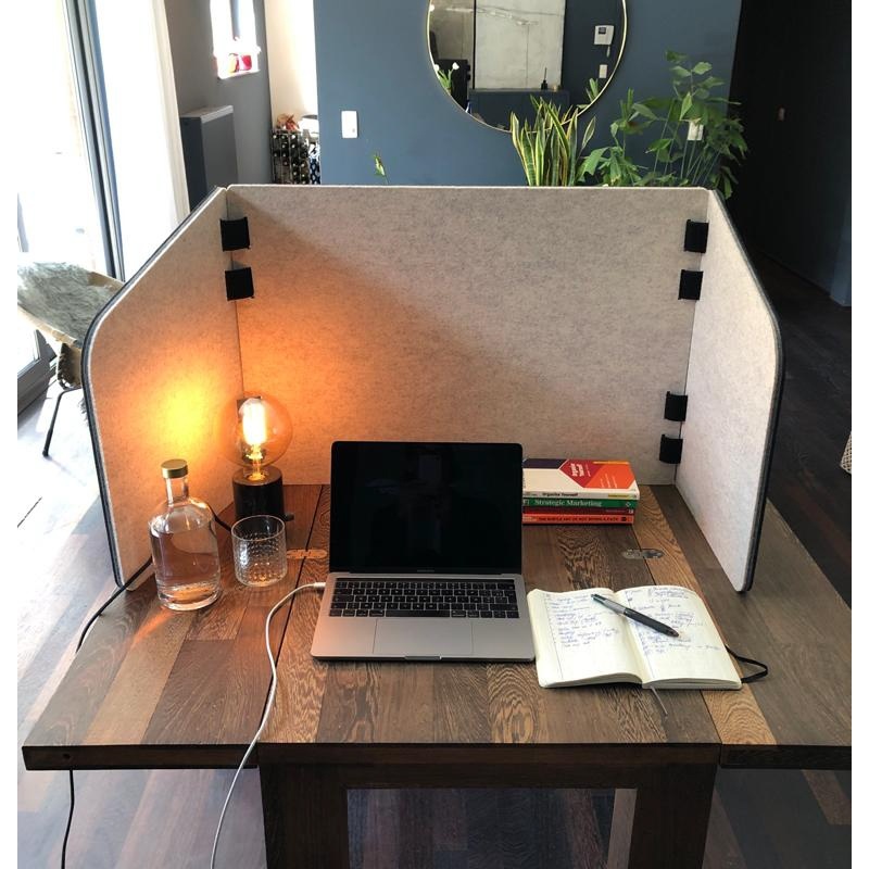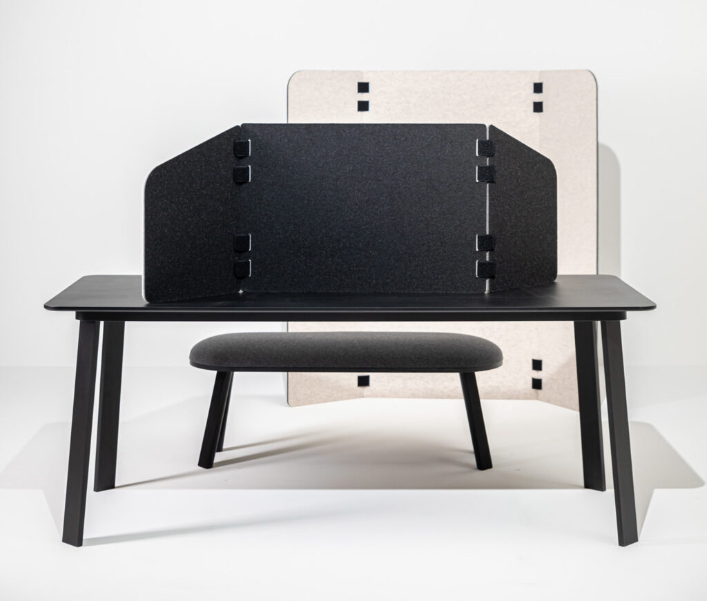Akoestisch scherm van het merk BuzziSpace, voor op het bureau of als kamerscherm om in alle rust te kunnen werken. Bureauscherm 55 x 80 x 40 cm, kamerscherm 150 x 80 x 40 cm.